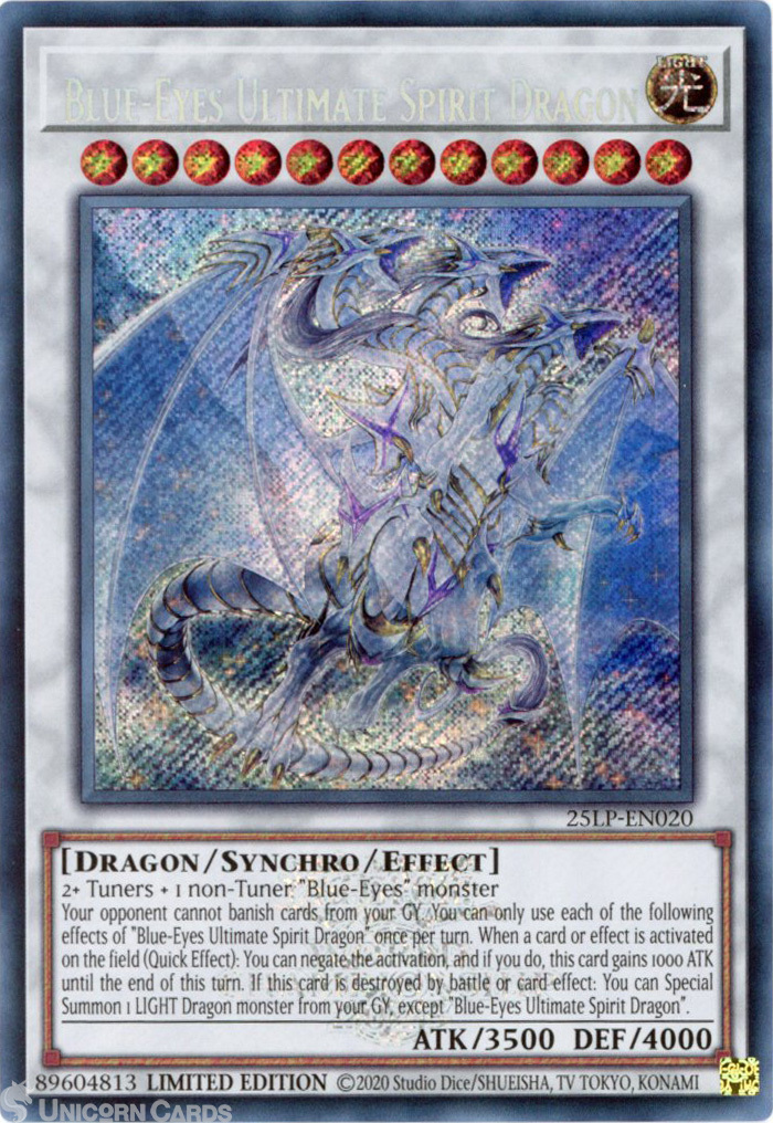 - 25LP-EN020 Blue-Eyes Ultimate Spirit Dragon : Emblazoned Secret Rare (Special Stamped Version) Limited Edition Mint YuGiOh Card