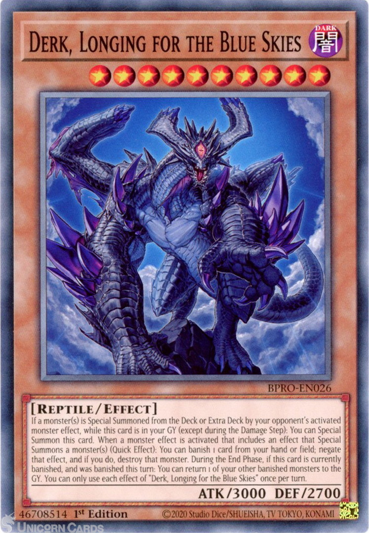 - BPRO-EN026 Derk, Longing for the Blue Skies : Common 1st Edition Mint YuGiOh Card