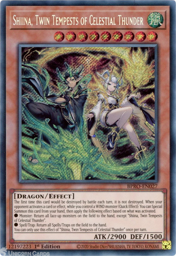 - BPRO-EN027 Shiina, Twin Tempests of Celestial Thunder : Secret Rare 1st Edition Mint YuGiOh Card