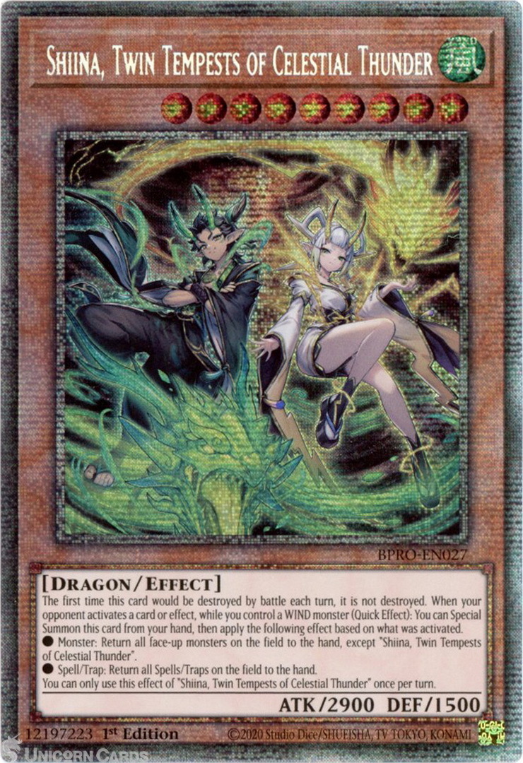 - BPRO-EN027 Shiina, Twin Tempests of Celestial Thunder : Starlight Rare 1st Edition Mint YuGiOh Card