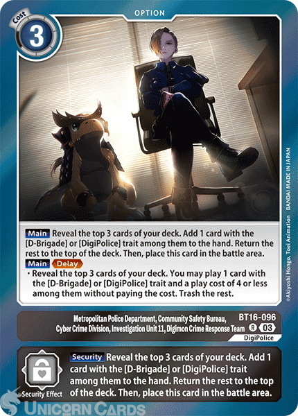 BT16-096 Metropolitan Police Department Community Safety Bureau Cyber Crime Division Investigation Unit 11 Digimon Crime Response Team : Rare Digimon Card : BT16: Beginning Observer