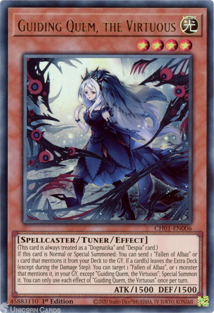 - CH01-EN006 Guiding Quem, the Virtuous : Ultra Rare 1st Edition Mint YuGiOh Card