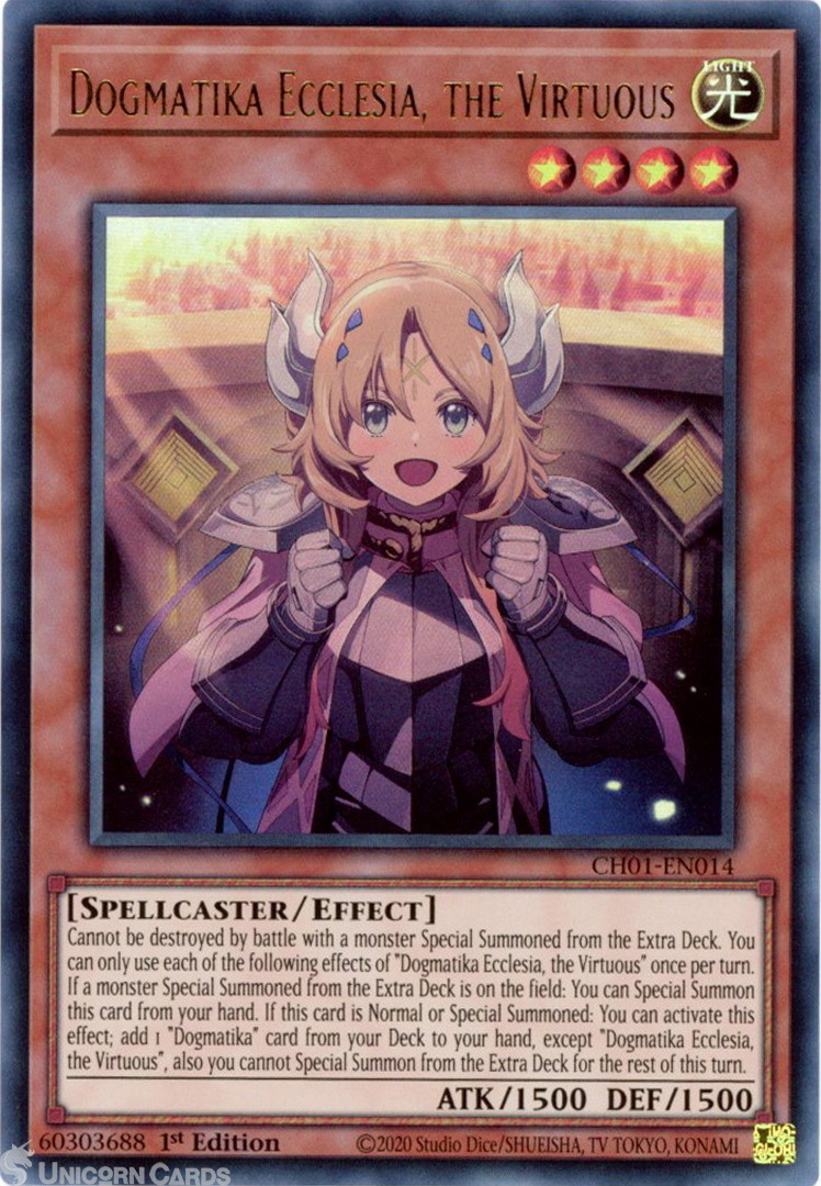 - CH01-EN014 Dogmatika Ecclesia, the Virtuous : Ultra Rare 1st Edition Mint YuGiOh Card