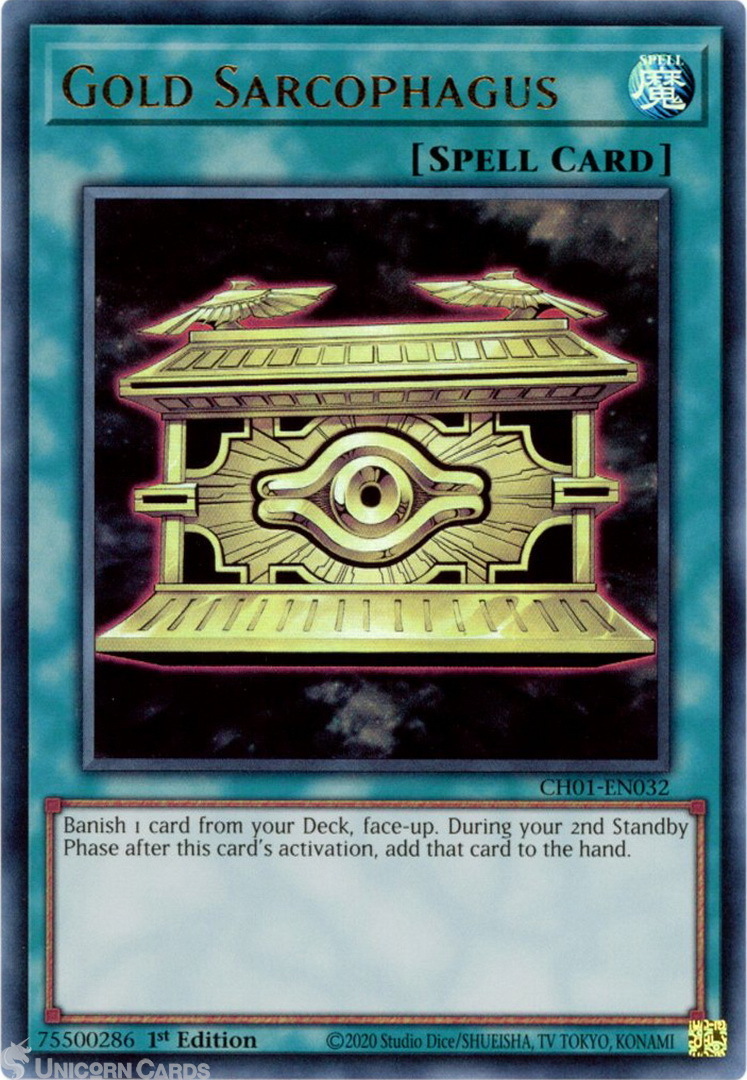 - CH01-EN032 Gold Sarcophagus : Ultra Rare 1st Edition Mint YuGiOh Card