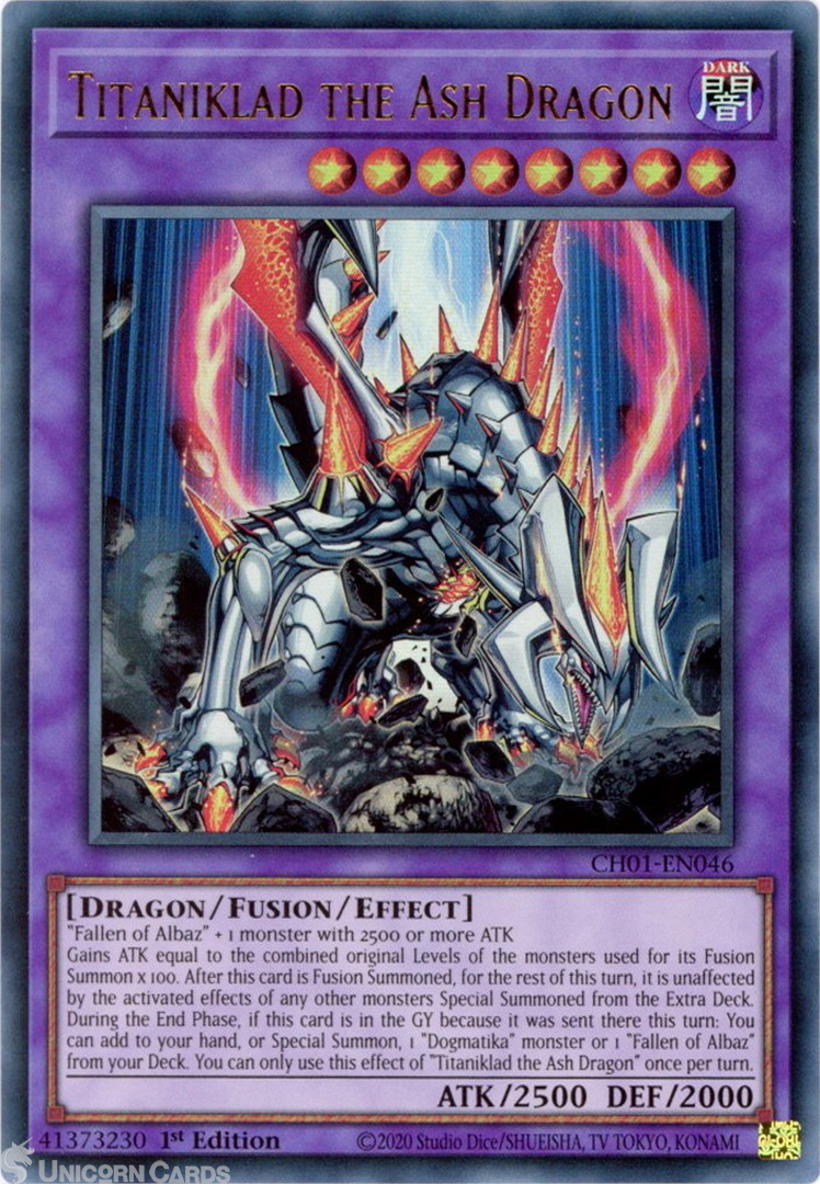 - CH01-EN046 Titaniklad the Ash Dragon : Ultra Rare 1st Edition Mint YuGiOh Card