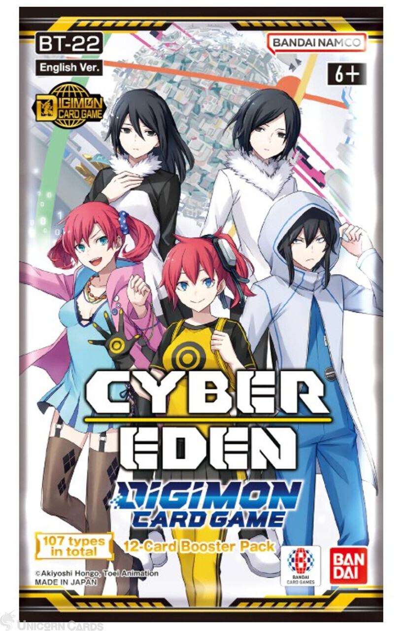 Digimon Card Game: Cyber Eden (BT22) is the 22nd main booster set, released in July 2025, focusing on characters and events from the "Digimon Story: Cyber Sleuth" game. The set introduces new Digimon, support cards, and strategic gameplay mechanics, expanding the card game's options. It includes 107 card types with a mix of common, uncommon, rare, super rare, and secret rare cards. Each booster pack contains 12 cards, and a booster box contains 24 packs.