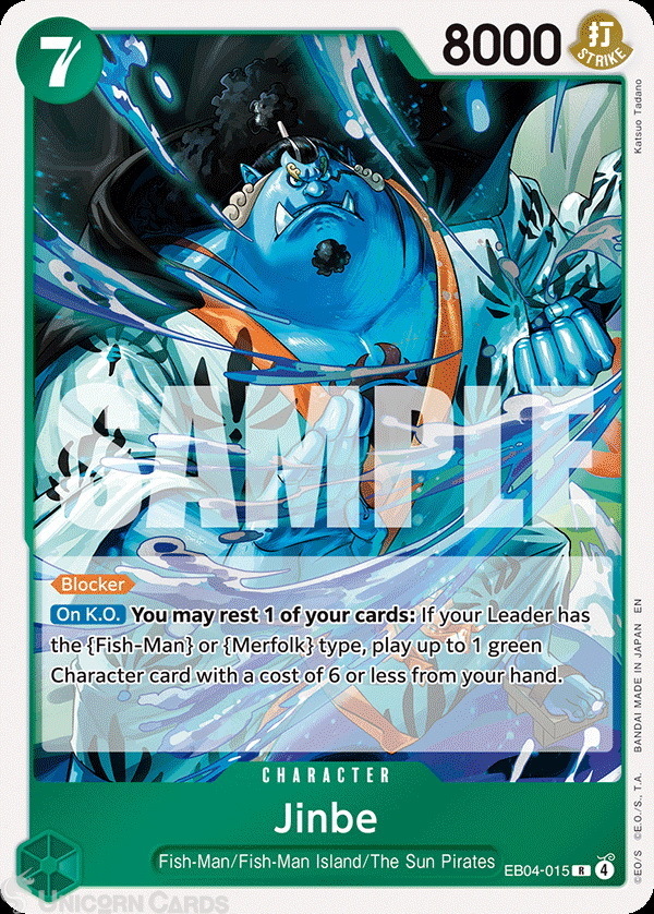- Effect: [Blocker] [On K.O.] You may rest 1 of your cards: If your Leader has the {Fish-Man} or {Merfolk} type, play up to 1 green Character card with a cost of 6 or less from your hand.