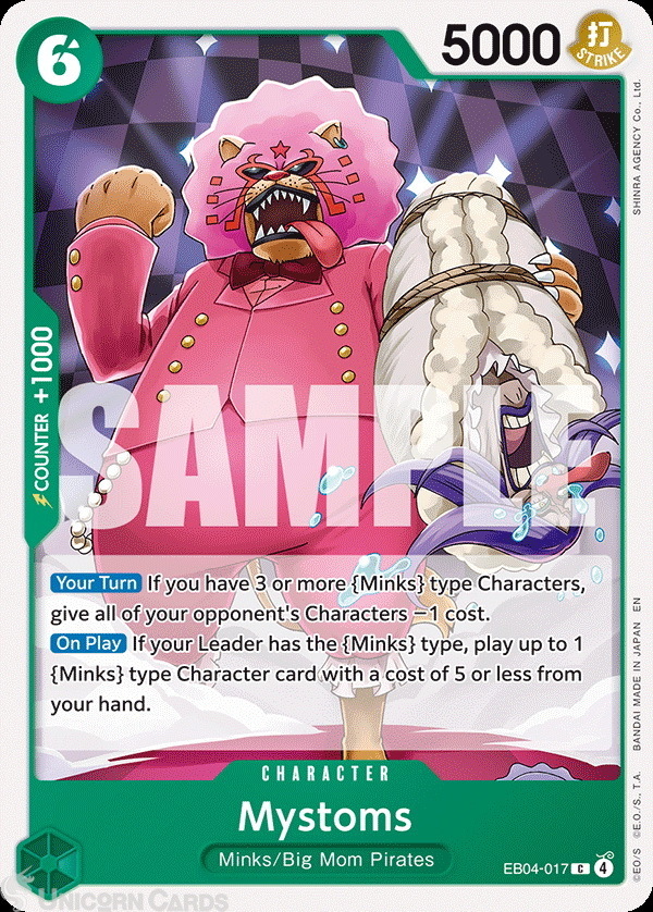 - Effect: [Your Turn] If you have 3 or more {Minks} type Characters, give all of your opponent's Characters −1 cost. [On Play] If your Leader has the {Minks} type, play up to 1 {Minks} type Character card with a cost of 5 or less from your hand.