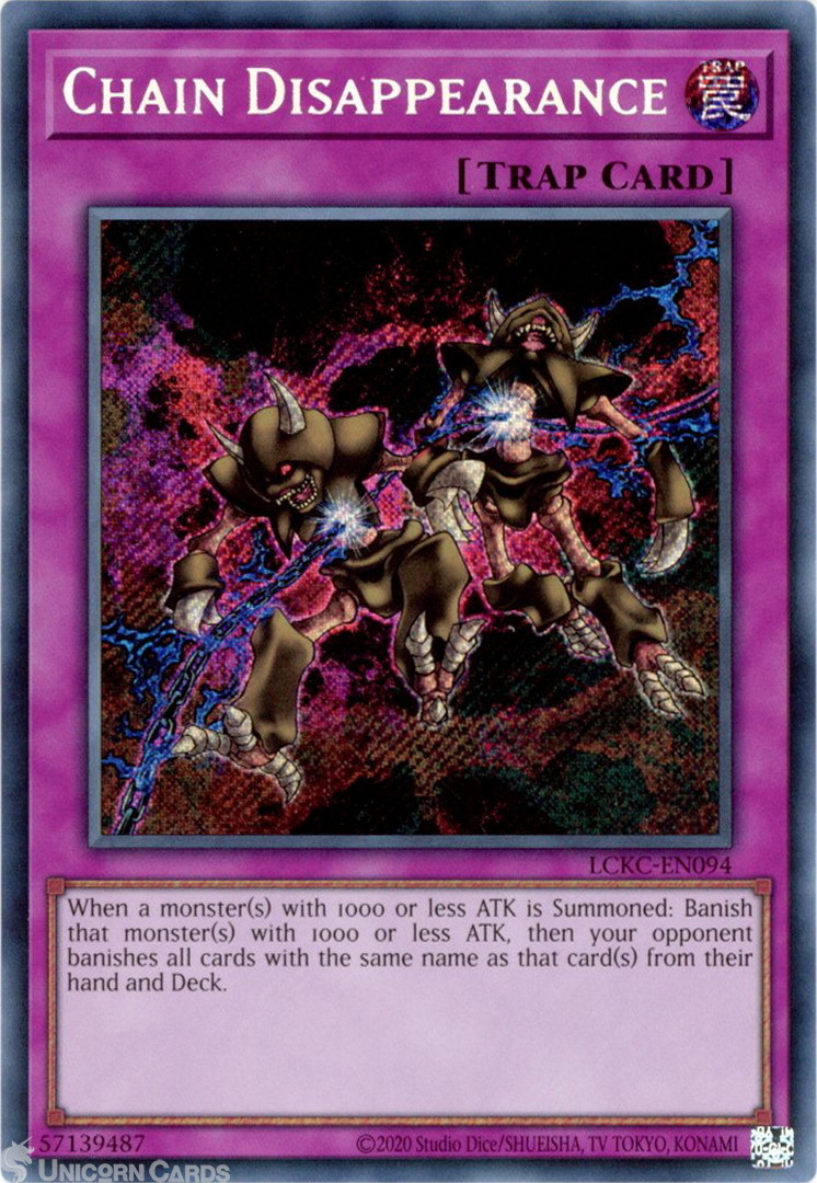 - LCKC-EN094 Chain Disappearance : Secret Rare UNL Edition Mint YuGiOh Card