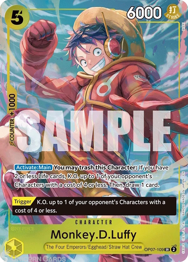 - Effect: [Activate: Main]You may trash this Character: If you have 2 or less Life cards, K.O. up to 1 of your opponent's Characters with a cost of 4 or less. Then, draw 1 card. [Trigger] K.O. up to 1 of your opponent's Characters with a cost of 4 or less.