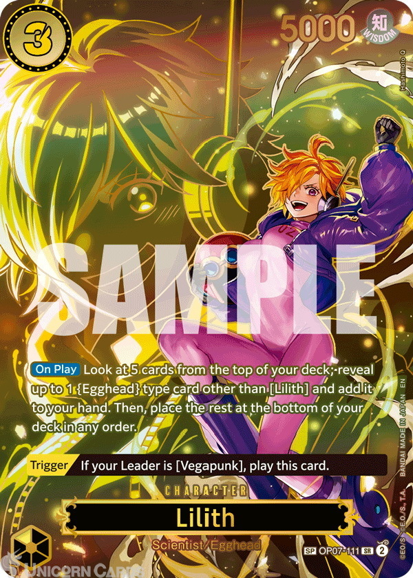 - Effect: [On Play] Look at 5 cards from the top of your deck; reveal up to 1 {Egghead} type card other than [Lilith] and add it to your hand. Then, place the rest at the bottom of your deck in any order. [Trigger] If your Leader is [Vegapunk], play this card.