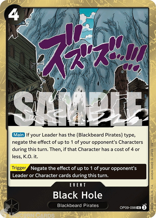- Effect: [Main] If your Leader has the {Blackbeard Pirates} type, negate the effect of up to 1 of your opponent's Characters during this turn. Then, if that Character has a cost of 4 or less, K.O. it. [Trigger] Negate the effect of up to 1 of your opponent's Leader or Character cards during this turn.