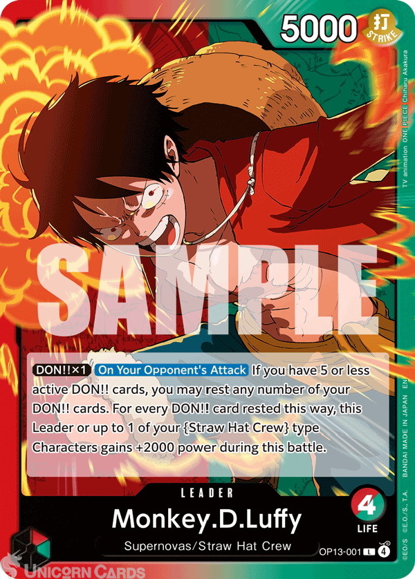- Effect: [DON!! x1] [On Your Opponent's Attack] If you have 5 or less active DON!! cards, you may rest any number of your DON!! cards. For every DON!! card rested this way, this Leader or up to 1 of your {Straw Hat Crew} type Characters gains +2000 power during this battle.