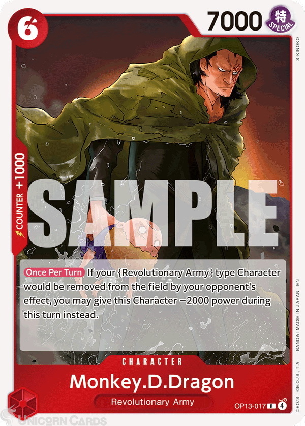 - Effect: [Once Per Turn] If your {Revolutionary Army} type Character would be removed from the field by your opponent's effect, you may give this Character -2000 power during this turn instead.