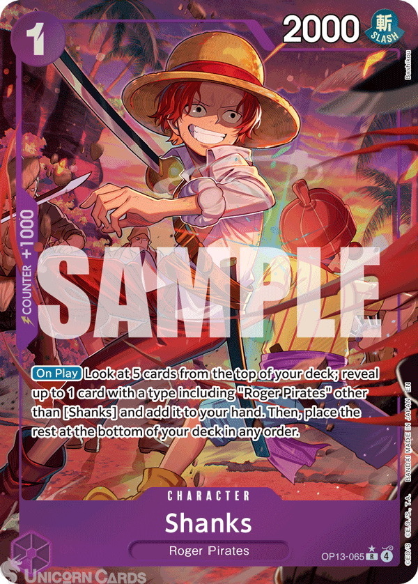 - Effect: [On Play] Look at 5 cards from the top of your deck; reveal up to 1 card with a type including "Roger Pirates" other than [Shanks] and add it to your hand. Then, place the rest at the bottom of your deck in any order.