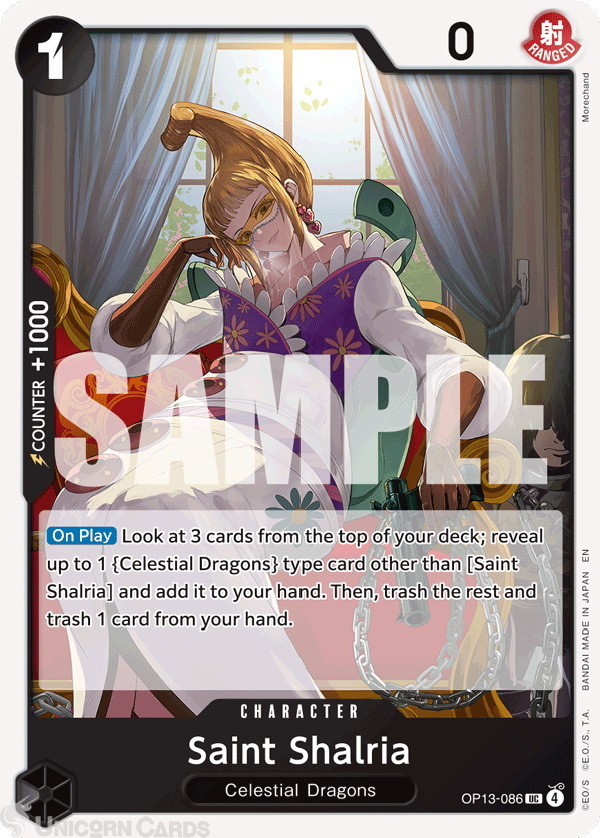 - Effect: [On Play] Look at 3 cards from the top of your deck; reveal up to 1 {Celestial Dragons} type card other than [Saint Shalria] and add it to your hand. Then, trash the rest and trash 1 card from your hand.