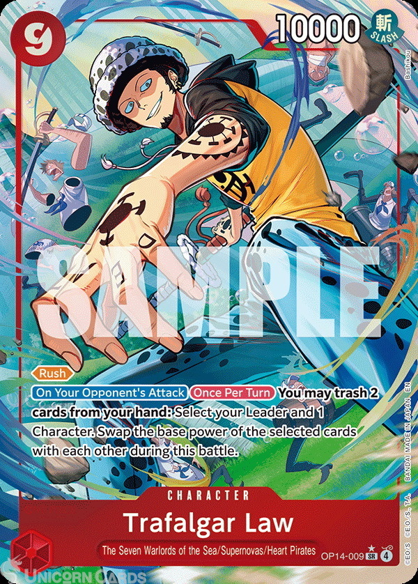 - Effect: [Rush] [On Your Opponent's Attack] [Once Per Turn] You may trash 2 cards from your hand: Select your Leader and 1 Character. Swap the base power of the selected cards with each other during this battle.