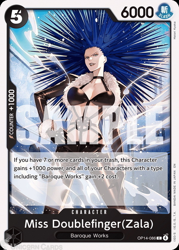 - Effect: If you have 7 or more cards in your trash, this Character gains +1000 power, and all of your Characters with a type including "Baroque Works" gain +2 cost.