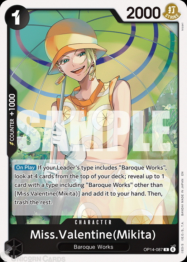 - Effect: [On Play] If your Leader's type includes "Baroque Works", look at 4 cards from the top of your deck; reveal up to 1 card with a type including "Baroque Works" other than [Miss.Valentine(Mikita)] and add it to your hand. Then, trash the rest.