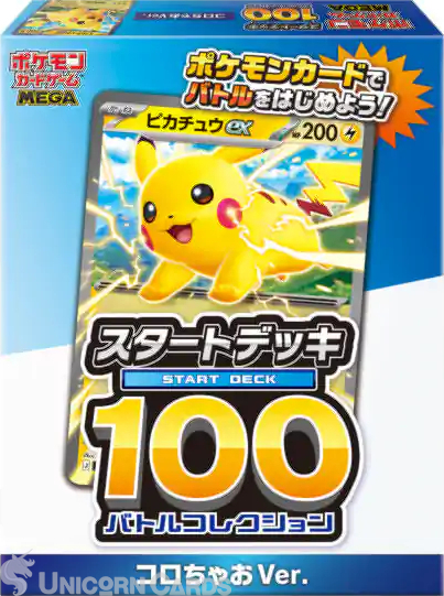 Part of the larger Start Deck 100 Battle Collection product line, the Start Deck 100 Battle Collection CoroCiao Version product is bundled as a purchase bonus with the first issue of CoroCiao, a new magazine series created by Shogakukan as a fusion between the CoroCoro Comic and Ciao magazines. The product includes a ready-to-play 60-card deck featuring a new Pikachu ex card. The deck also includes a "Deck No." card like those from the Start Deck 100 Battle Collection that identifies the CoroCiao Version as "Deck No. 000/100", as well as a sheet of damage counters and status markers, and a player's guide.