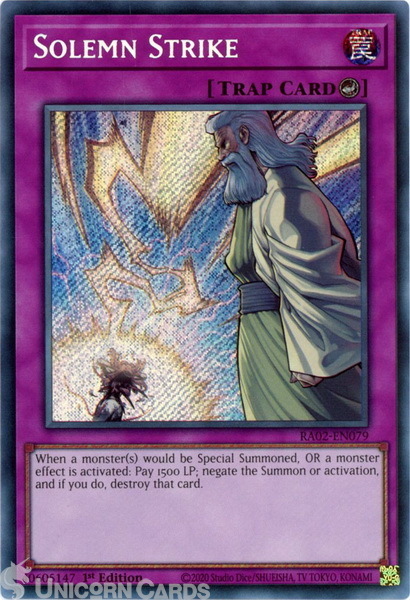 - RA02-EN079 Solemn Strike : Secret Rare 1st Edition YuGiOh Card