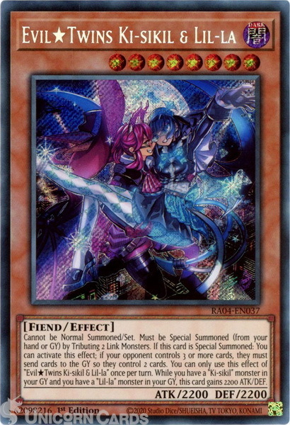 - RA04-EN037 Evil★Twins Ki-sikil & Lil-la : Secret Rare 1st Edition Mint YuGiOh Card