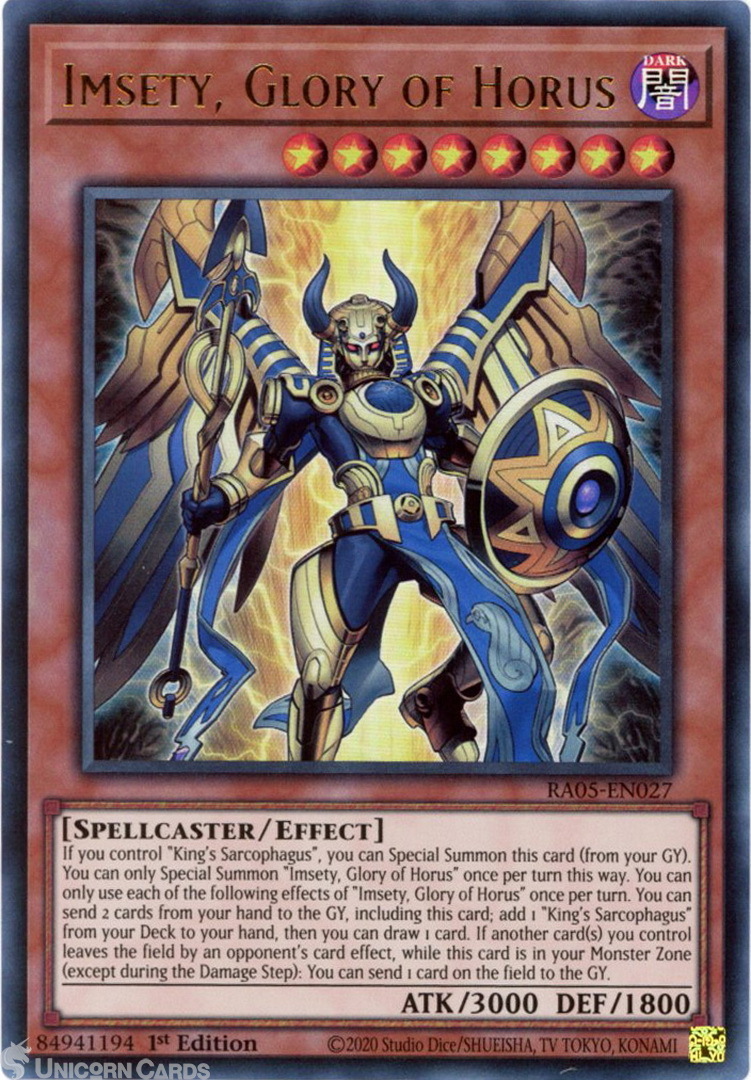 - RA05-EN027 Imsety, Glory of Horus : Ultra Rare 1st Edition Mint YuGiOh Card