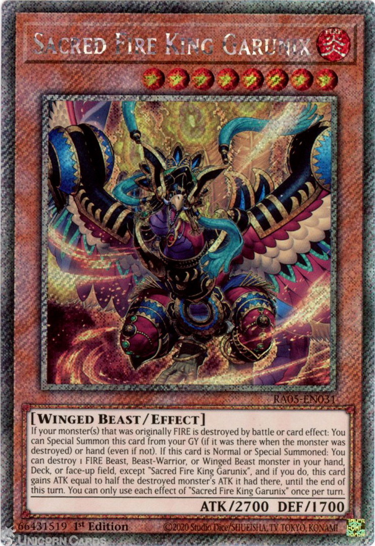 - RA05-EN031 Sacred Fire King Garunix : Platinum Secret Rare 1st Edition Mint YuGiOh Card