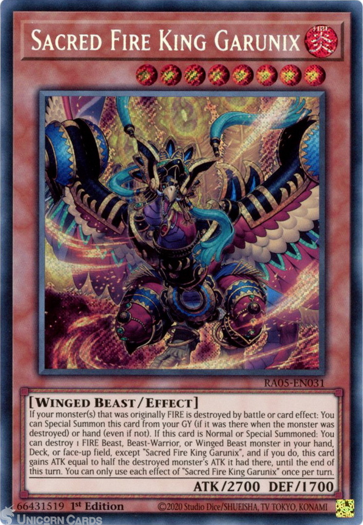 - RA05-EN031 Sacred Fire King Garunix : Secret Rare 1st Edition Mint YuGiOh Card