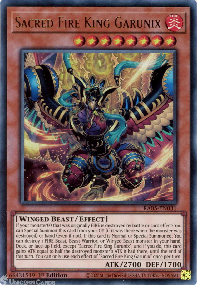 - RA05-EN031 Sacred Fire King Garunix : Ultra Rare 1st Edition Mint YuGiOh Card