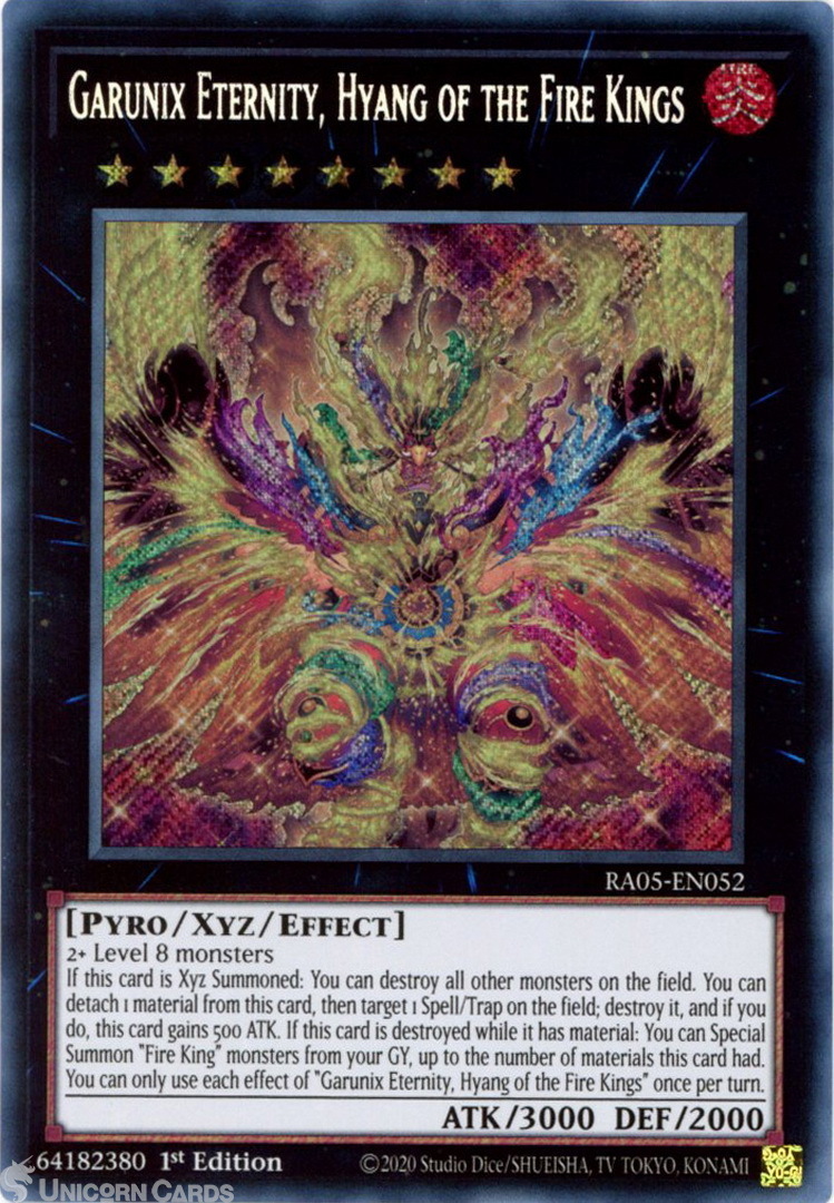 - RA05-EN052 Garunix Eternity, Hyang of the Fire Kings : Secret Rare 1st Edition Mint YuGiOh Card