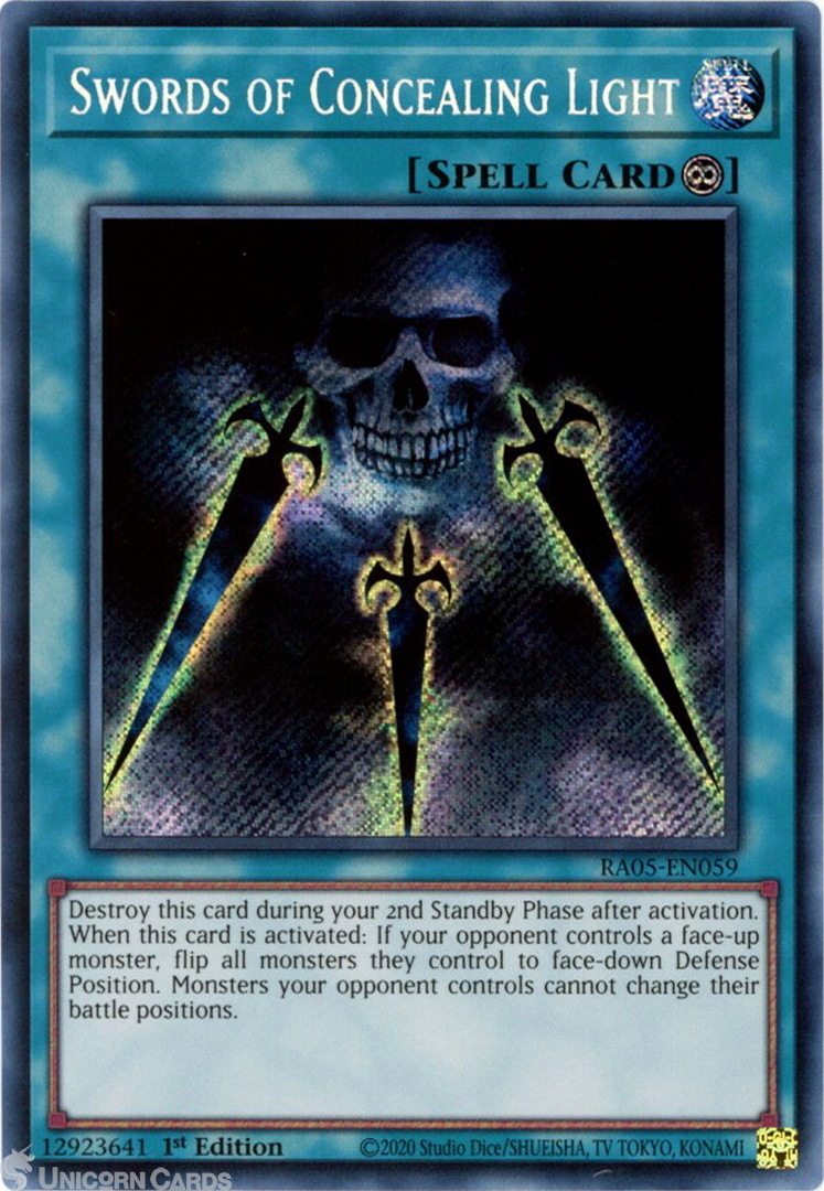 - RA05-EN059 Swords of Concealing Light : Secret Rare 1st Edition Mint YuGiOh Card