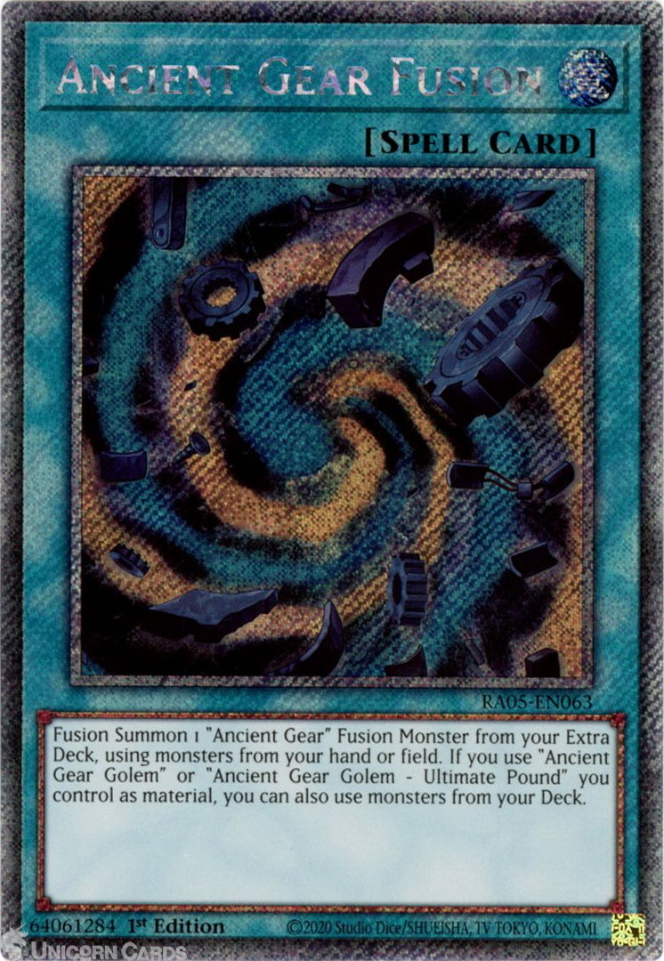 - RA05-EN063 Ancient Gear Fusion : Platinum Secret Rare 1st Edition Mint YuGiOh Card