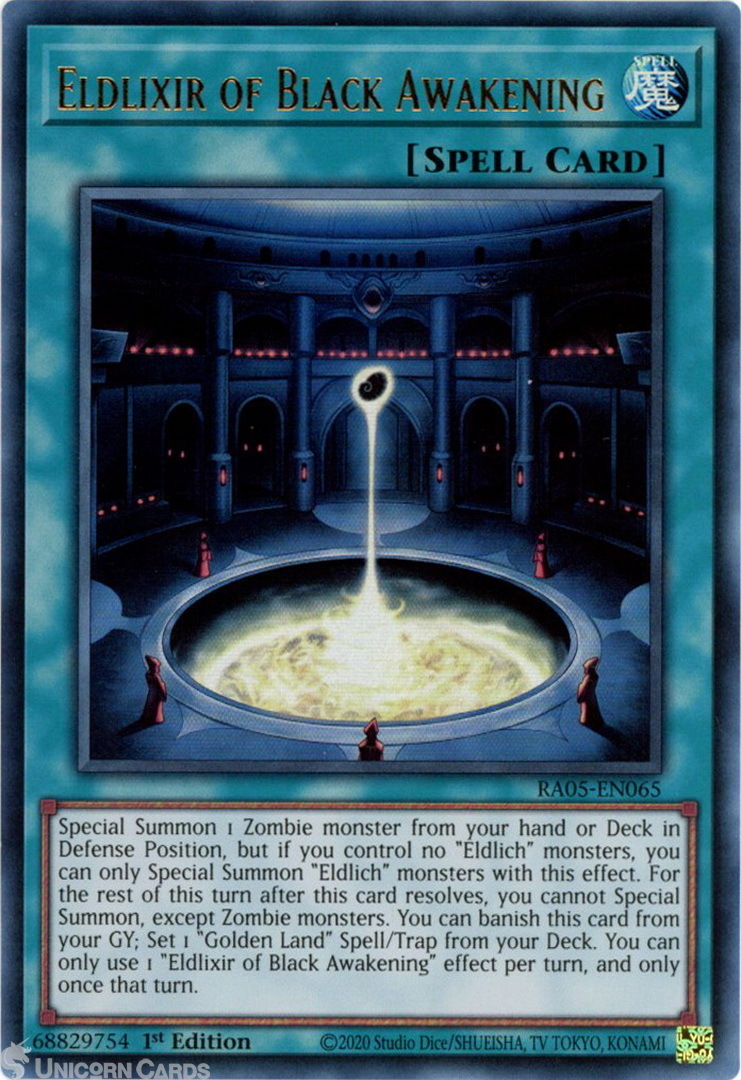 - RA05-EN065 Eldlixir of Black Awakening : Ultra Rare 1st Edition Mint YuGiOh Card