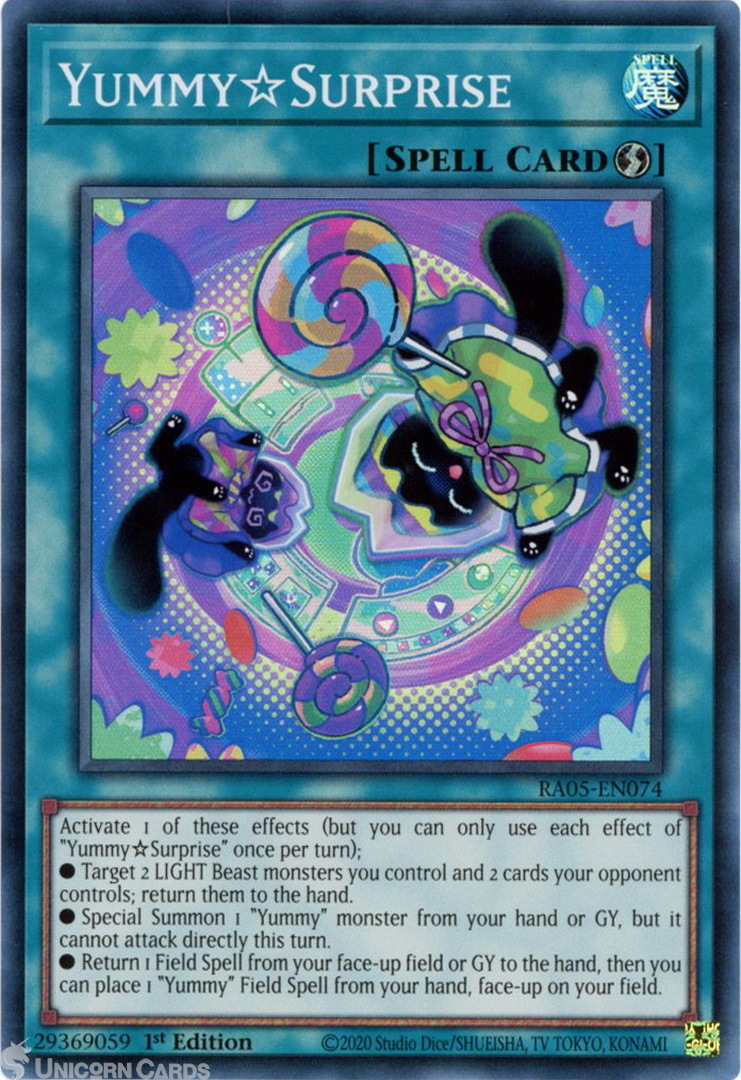 - RA05-EN074 Yummy☆Surprise : Super Rare 1st Edition Mint YuGiOh Card