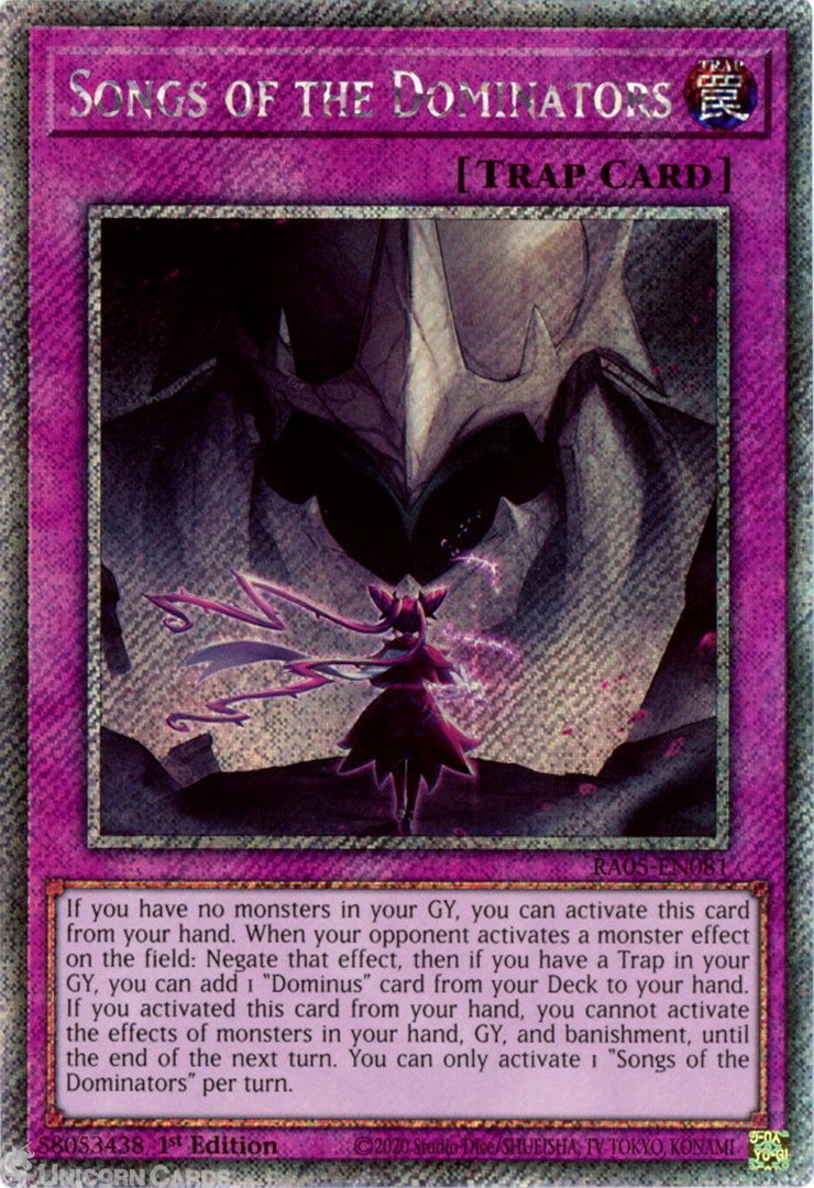 - RA05-EN081 Songs of the Dominators : Platinum Secret Rare 1st Edition Mint YuGiOh Card