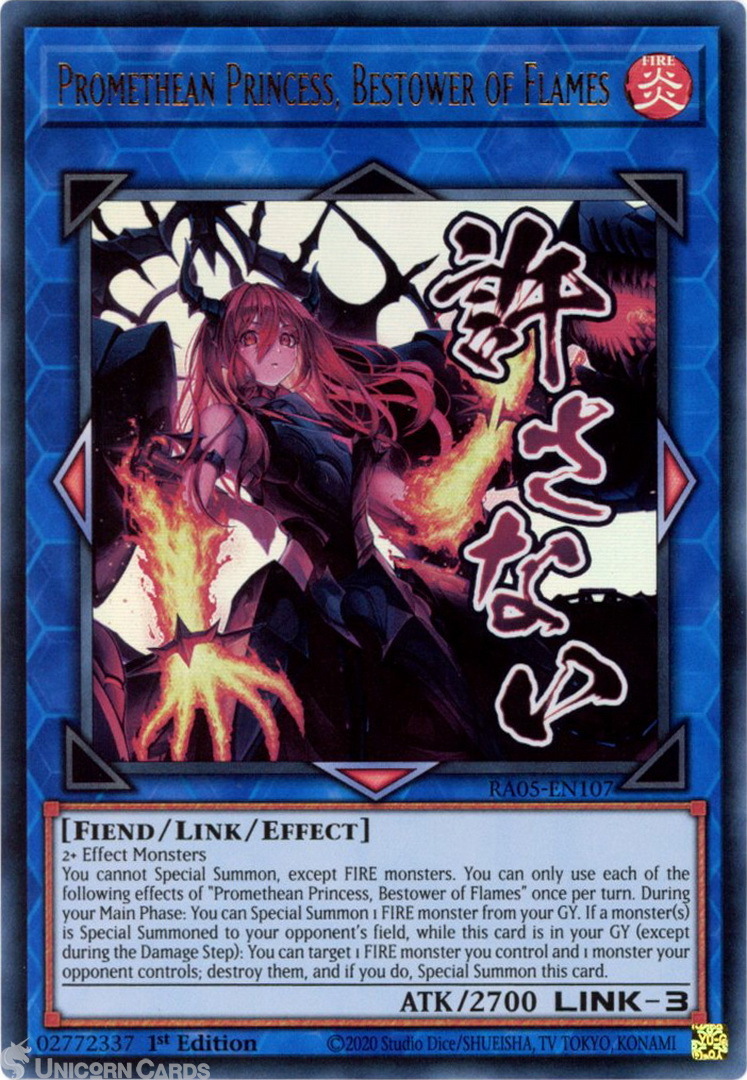- RA05-EN107 Promethean Princess, Bestower of Flames (Stamp Artwork) : Ultra Rare 1st Edition Mint YuGiOh Card