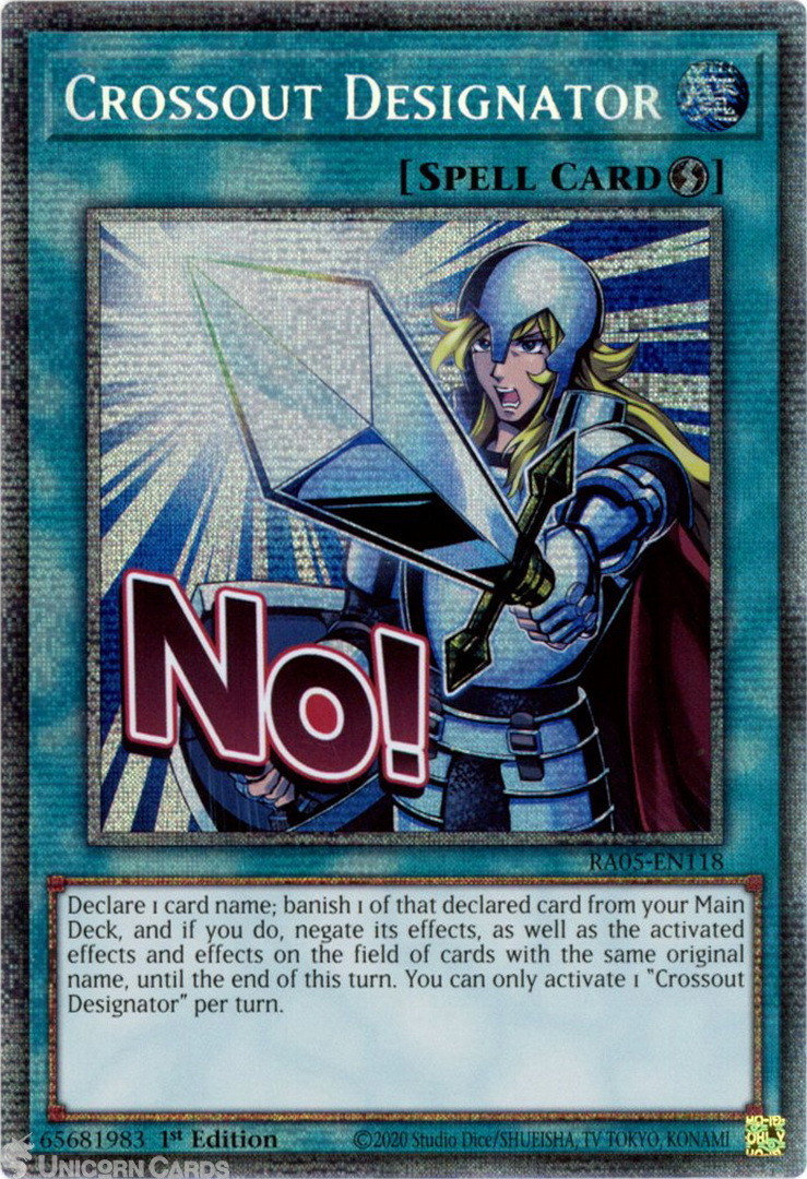 - RA05-EN118 Crossout Designator (Stamp Artwork) : Starlight Rare 1st Edition Mint YuGiOh Card