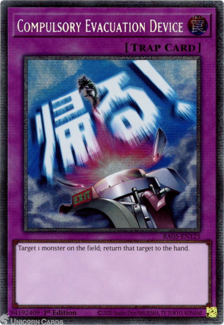 - RA05-EN125 Compulsory Evacuation Device (Stamp Artwork) : Starlight Rare 1st Edition Mint YuGiOh Card