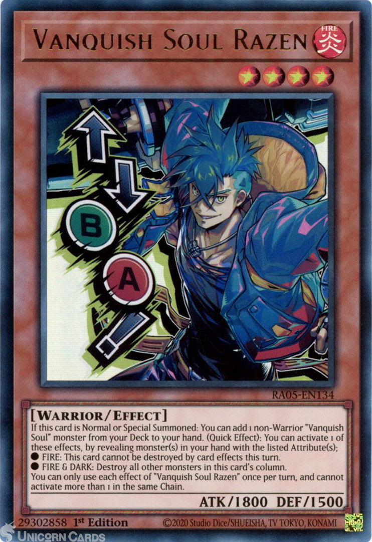 - RA05-EN134 Vanquish Soul Razen (Stamp Artwork) : Ultra Rare 1st Edition Mint YuGiOh Card