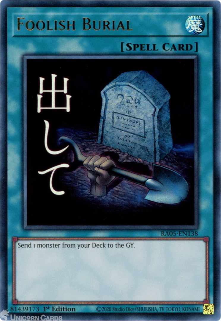 - RA05-EN138 Foolish Burial (Stamp Artwork) : Ultra Rare 1st Edition Mint YuGiOh Card