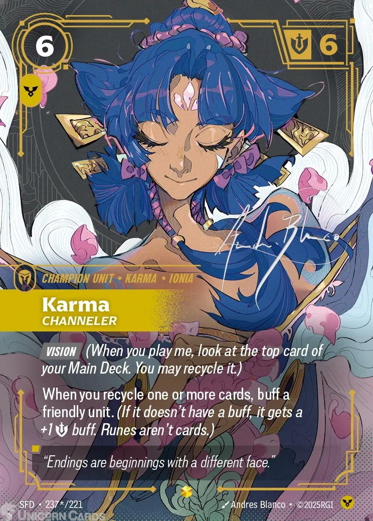 SFD-237s Karma - Channeler (Signature) : Showcase Foil Riftbound TCG Card : Spiritforged