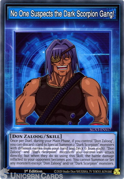 - SGX3-ENS17 No One Suspects the Dark Scorpion Gang! :: Common Skill Card 1st Edition Mint YuGiOh Card